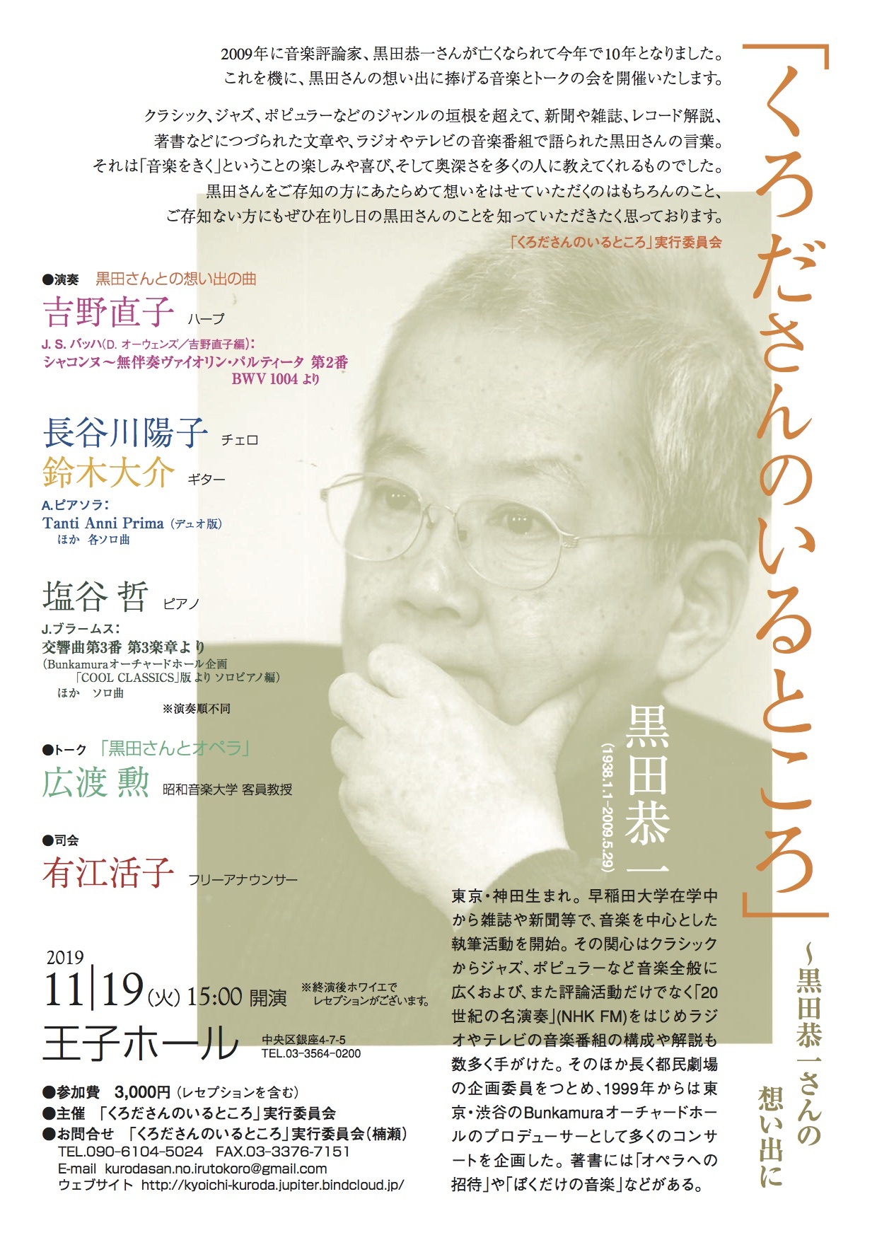 音楽評論家、黒田恭一氏が亡くなられて今年で10年となりました。これを機に、黒田さんの想い出に捧げる音楽とトークの会を開催いたします。